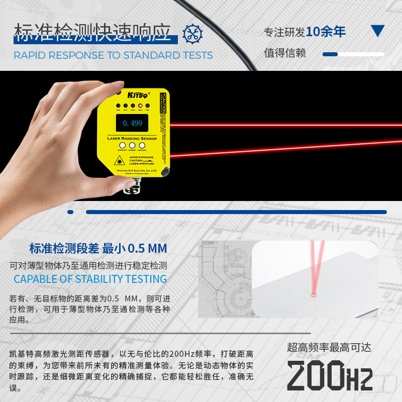 凯基特激光测距传感器可测垂直或倾斜的目标,不受颜色、材料或光泽度影响。越限继电器输出,支持NPN/PNP,电压模拟输出;优异的范围、重复精度和准确度组合可实现高度可靠的目标检测和精确的距离测量;五个8段显示屏和按钮编程,易于安装、故障排除和实时距离测量。
