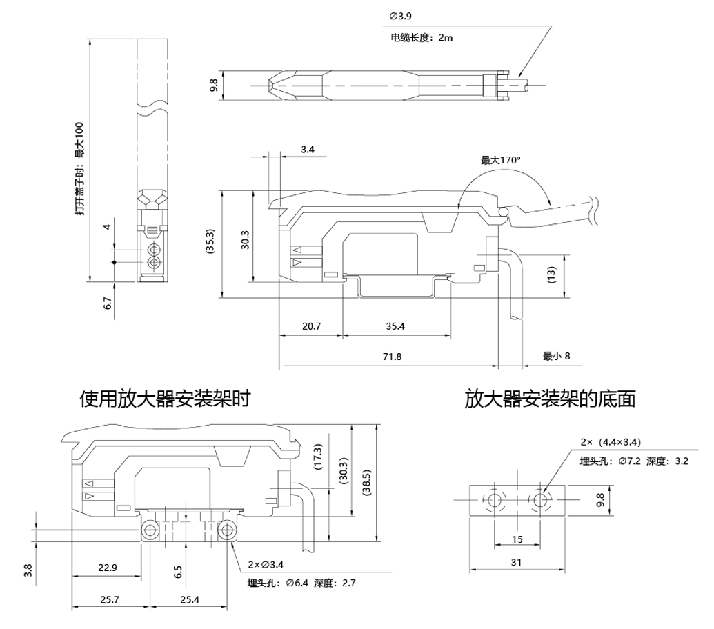 适合检测微小物体和微小色差,适应狭小空间和不良环境安装的高性能光纤传感器◆光纤检测头小巧,适应狭小空间安装,光纤头能在电磁干扰大,温差大,湿度大,需防爆的场合等不良环境中可靠工作。◆操作简单,灵敏度可调