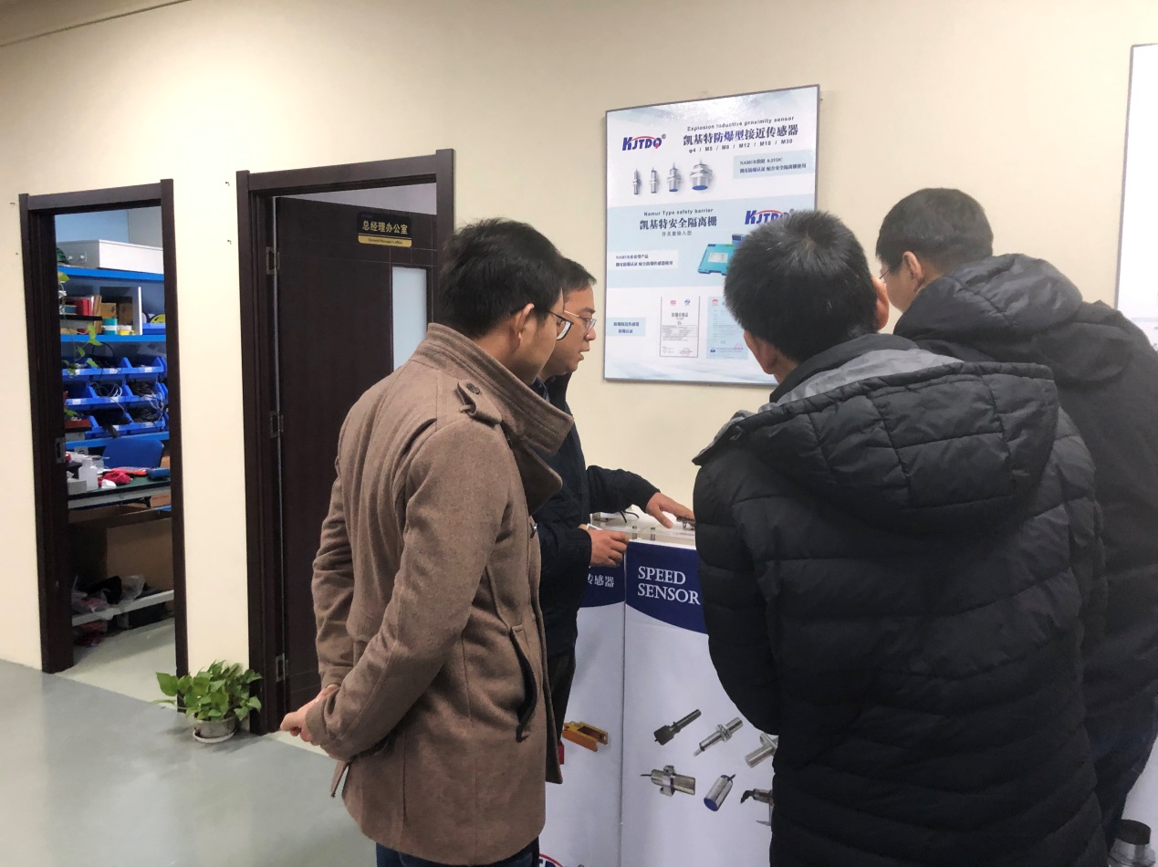 领导一行先后参观了各个生产车间、研发部,为所有员工带来亲切的慰问,重点参观了我司产品展厅,张经理向领导们详细介绍了接近传感器、光电传感器、无线传感器、速度传感器、压力传感器、防爆传感器、行程限位开关等,领导们对我司产品评价高度赞赏,充分认可我司产品品质,也对我司十多年来的高速发展表示赞叹!