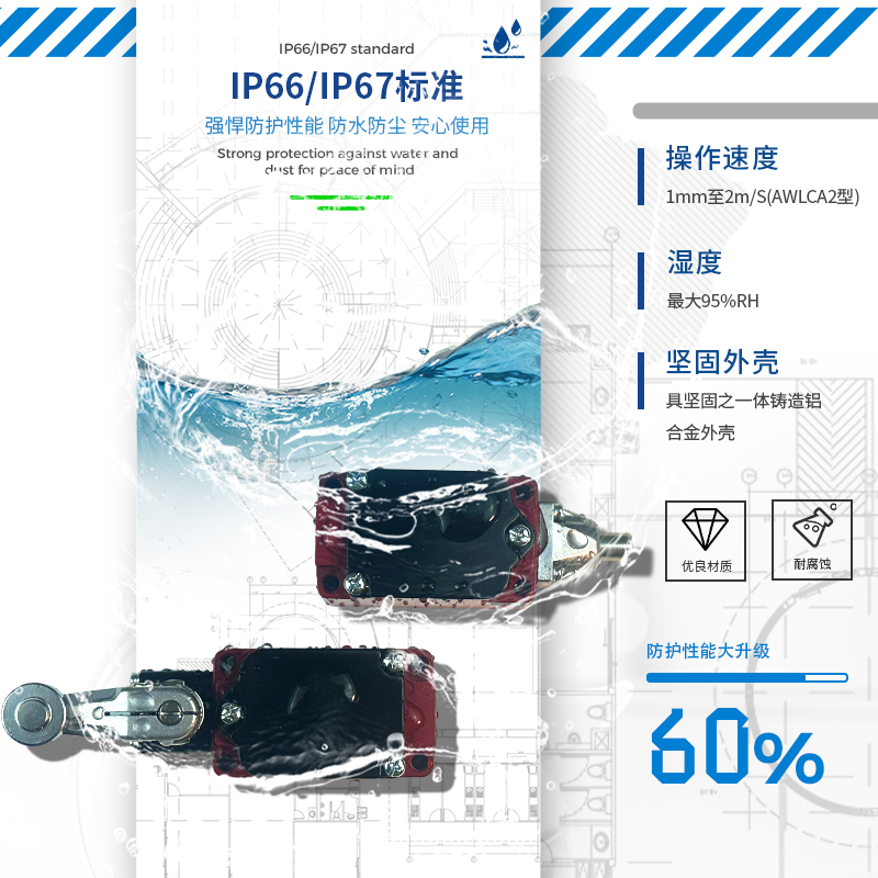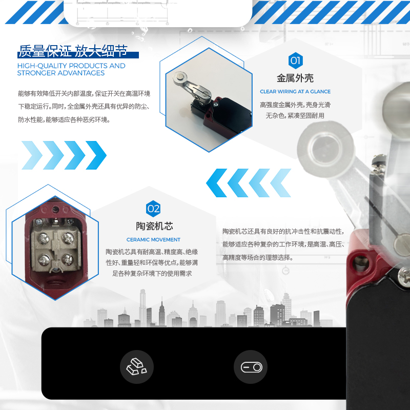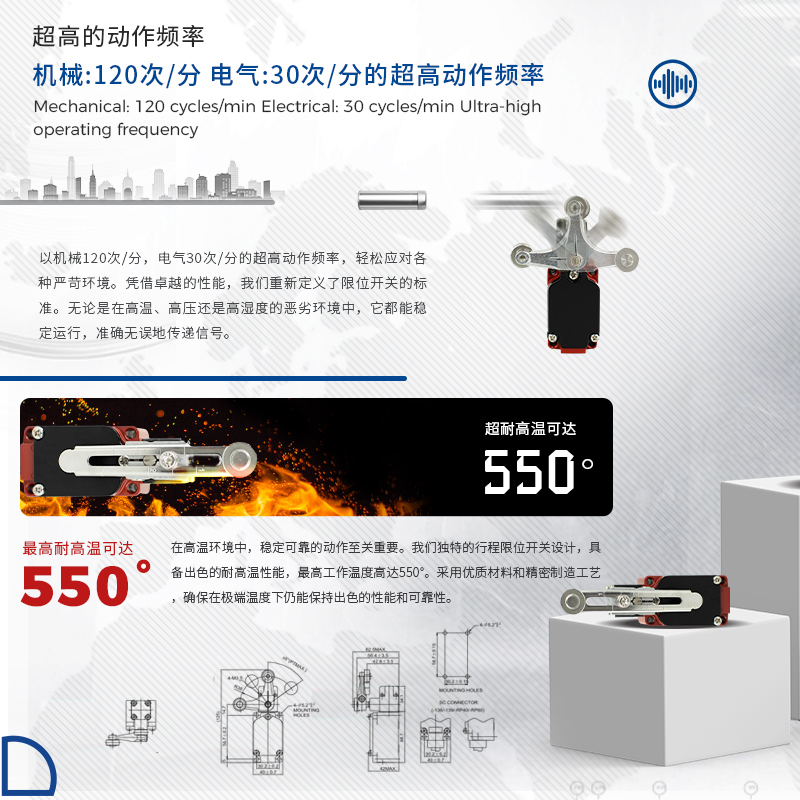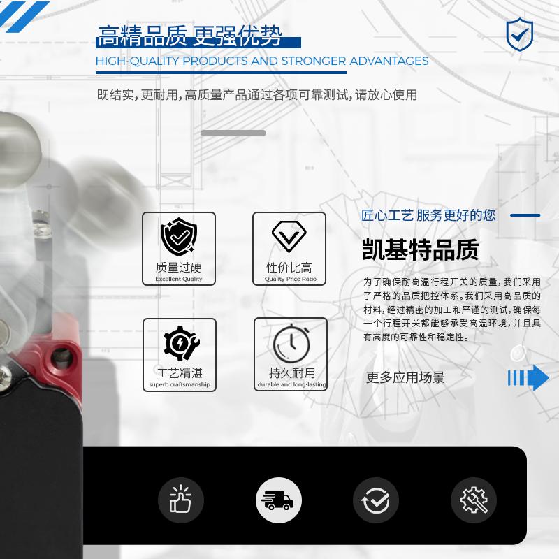 凯基特耐高温行程开关具有以下优点:超位报警,安全可靠,接触检测,磨损小。耐高温最高可达550℃。铝合金外壳 高机械强度,防护等级IP67 耐油、防水和防压结构。