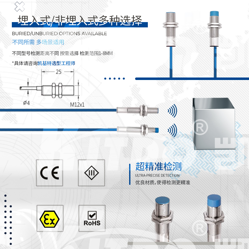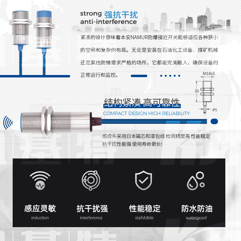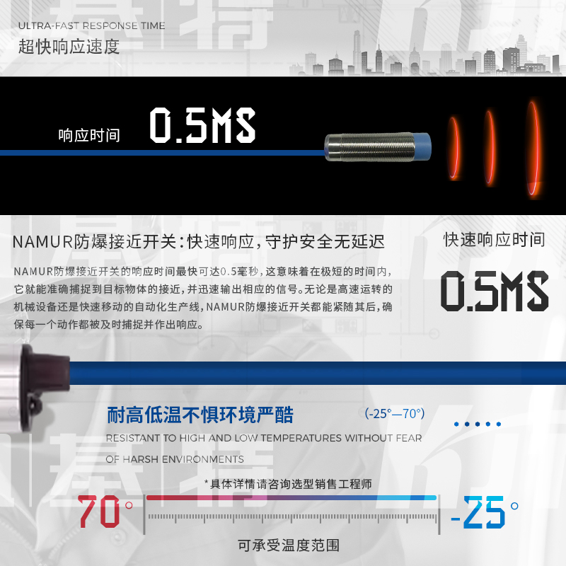 凯基特本安NAMUR接近开关主要应用于需要防爆的场合设备和环境,如煤矿、石化等, NAMUR信号为世界上应用最广泛的本质安全的数字量输入和频率量输入的标准信号。其最早为德国标准( DIN19234 )。后成为欧洲标准( EN 50227,DIN EN 60947-5-6 )。NAMUR信号为无源2线制,标称8VDC供电,1mA 和3mA开关信号。NAMUR型传感器均为本质安全防爆仪表,通常与隔离式安全栅配合使用。