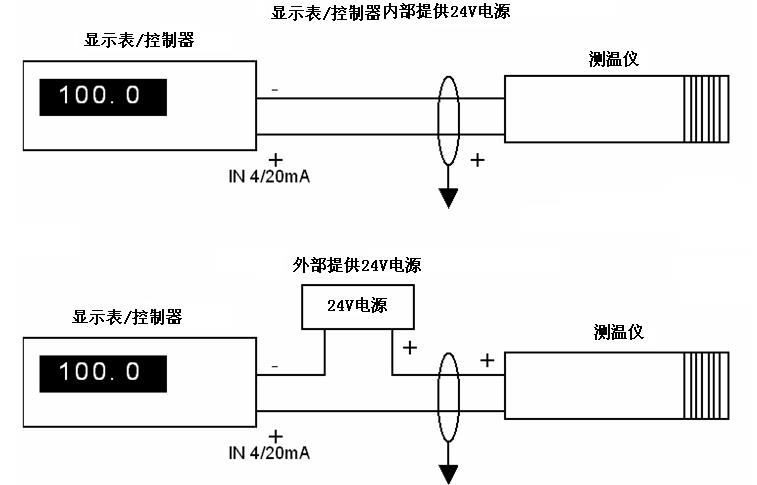 对于4~20mA的模拟信号输出。为两线制环路电流输出方式,其与显示器或控制器的连接,有以下两种典型应用(连接法):
